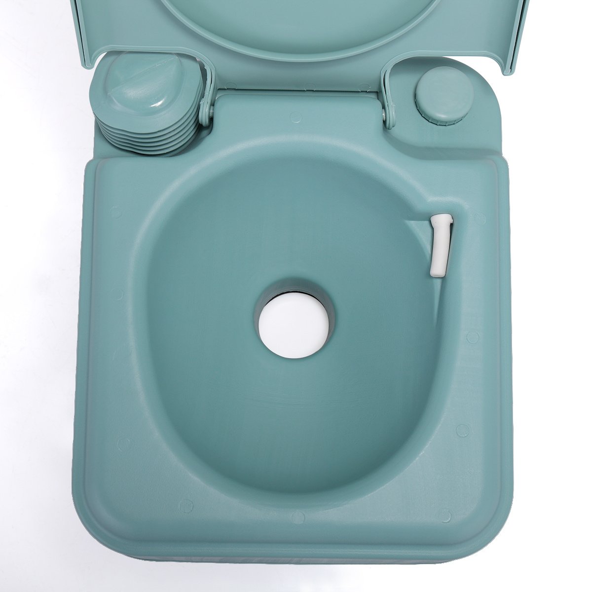 Color: greenProduct material: HDPEProcess: blow moldingThe main components of the product include:Toilet cover; toilet seat; air pressure pump; water tank filling port; flushing port; 2 side buckles; baffle handle (with the English letter "PULL"); clean water tank; sewage tank.Drainage method: ground type;Toilet type: split type;Toilet flushing method: air-assisted actuation.The overall size of the product is 34.5*41.6*42.4cm; the outer diameter of the toilet seat: 23*26.5CM; the volume of the water tank is 12 liters; the volume of the waste water tank is 20 liters;Bearing weight 100KG.There is a full English instruction manual for the product on the inside of the toilet lid.
