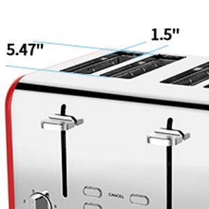 Extra-Wide 4 Slots for Toasting  Slot in Width: 1.5 inchSlot in Length: 5.47 inchWide Slots make it easy to toast a bagel, thicker bread, and English muffins.Auto Pop-up, easy take out and don't worry to get scalded |